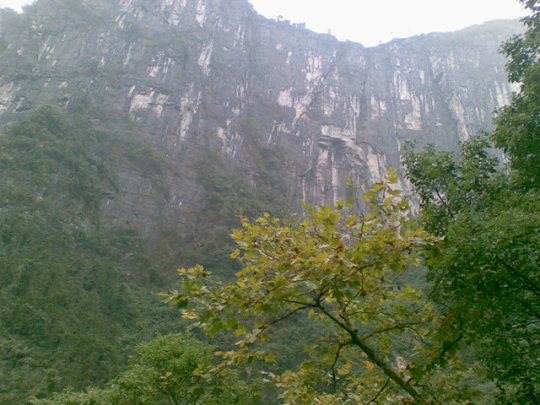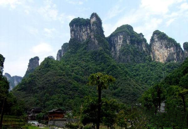 從玉鉆峰沿公路向北行2公里,但見(jiàn)溪谷兩岸石壁陡峭如削,高千仞,絕壁間石紋如畫(huà),青白相間,加上有古木翠草點(diǎn)綴,如同畫(huà)屏。這就是“天門(mén)畫(huà)壁”。走過(guò)“天門(mén)畫(huà)壁”,便見(jiàn)三座石峰緊緊相連,這就是“相依巖”。高200余米,活象三個(gè)石人相依而立,靠前的一個(gè)是頭戴銀花首飾、身著百褶花羅裙的苗姑,緊靠后的一個(gè)是頭纏花帕、身穿對(duì)襟短衣的苗族男子,靠左的一個(gè)是頭纏絲帕、身著胸襟式土布衣的老媒人。