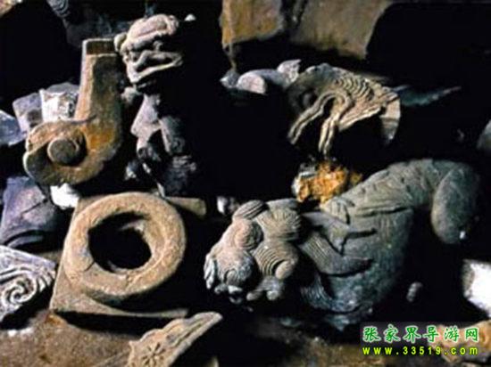 土司古墓群多集中于司城紫金山、雅草坪、帕桶湖三個地方,其中以紫金山最多。據(jù)勘察,紫金山一處共有土司王及其貴族墳?zāi)?09座。彭福石沖以后的土司、土官及其眷屬,都分別埋葬在這里。古墓的規(guī)模大小,視其官爵而定。從已挖開的30多座古墓來看,基本形式是用土磚拱成半圓形,墓前有石人石馬,四周筑有圍墻,進(jìn)出必經(jīng)鐵門。墓室四壁上刻有精美的花草圖案和龍鳳圖案。棺材系楠木、梓木做成,用土漆漆成烏黑色,并用鐵鉤懸掛在石室之內(nèi)。隨葬器物也極為豐富,有金花、金譬、發(fā)插、耳環(huán)、蓮蓬等金銀飾物,還有各種玉器等。明代一些名土司彭顯英、彭冀南等人的墳?zāi)怪两裆斜4嫱旰?。古墓群現(xiàn)為湖南省重點(diǎn)文物保護(hù)單位。
