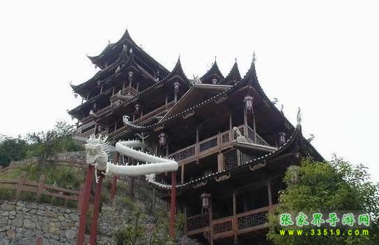 望郎峰北隔幽谷西望,一巨大石壁高聳云端,面寬達(dá)百米。因受風(fēng)雨剝蝕,流痕結(jié)網(wǎng),與頂端參差不齊的峰石結(jié)合,構(gòu)成錯落有致的一幅壁畫:林木掩映的圍墻之內(nèi),池塘水榭,墻垣瓦梁,依稀可見。還有幾座吊腳樓,幾座寺廟,其間仿佛有人來往。雨天,云霧飄拂,樓臺墻垣若隱若現(xiàn),儼然海市蜃樓。