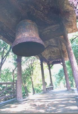 飛來鐘原為君山崇勝寺的古鐘,南宋淳佑五年(公元 1245 年),荊湖安撫制置使孟珙重修崇勝寺時復(fù)制一鐘,鐘高一丈多,大數(shù)圍,重4000余斤,上有“淳佑五年造”,鐘身上鑄有“皇帝萬歲,國泰民安,風(fēng)調(diào)雨順,五谷豐登”16 個大字,四方凸出的部分用青銅澆鑄的四條金龍,栩栩如生,形態(tài)逼真。原鐘在1966 年被砸毀,現(xiàn)在的飛來鐘是1979 年由市閥門廠復(fù)制而成,高約2 米,直徑1.2 米,重約 2 噸。鐘身上改鑄著鐘相、楊幺起義的戰(zhàn)斗口號“均貧富,等貴賤”六字,比前者更富有深刻的含義。這口古鐘有段優(yōu)美的傳說。相傳南宋初年,洞庭湖畔數(shù)以十萬計的農(nóng)民在楊幺率領(lǐng)下,掀起了轟轟烈烈的農(nóng)民起義。相傳一天夜晚,朝廷派兵前來偷襲駐扎在君山的楊幺寨,忽然從天上飛來一口巨鐘,鐘聲陣陣,催醒義軍,奮起抗敵,因此叫飛來鐘。這是人們深切懷念楊幺起義軍,用各種方式來表達贊美之情。古鐘的傳說便寄托了人們的這種心情。有人據(jù)此認為,原來的飛來鐘系楊幺起義軍所鑄的報警器。