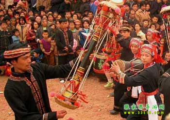 仗鼓舞是白族的一種獨(dú)特舞蹈,尤其是張家界天子山一帶的白族人,大都愛跳仗鼓舞。逢年過(guò)節(jié)、游神、趕會(huì),山山寨寨都要舉行歡樂的“跳舞節(jié)”。仗鼓舞根據(jù)人數(shù)多少,分為4人舞、8人舞、32人舞等多種形式,主要道具是仗鼓,鼓長(zhǎng)1.2米,兩頭粗,中間細(xì),因兩頭緊繃牛皮,敲擊時(shí)便“嘭嘭”作響。跳舞前須祭祀祖先,然后由三位德高望重的老者先入場(chǎng)引導(dǎo)圍圈歡跳,擺呵、蹬呵、拍呵,繞著場(chǎng)子一圈又一圈地跳,鼓聲陣陣,還有嗩吶、笛子等樂器伴奏,舞姿靈活多變,古樸大方,驚險(xiǎn)敏捷,民族色彩濃郁。