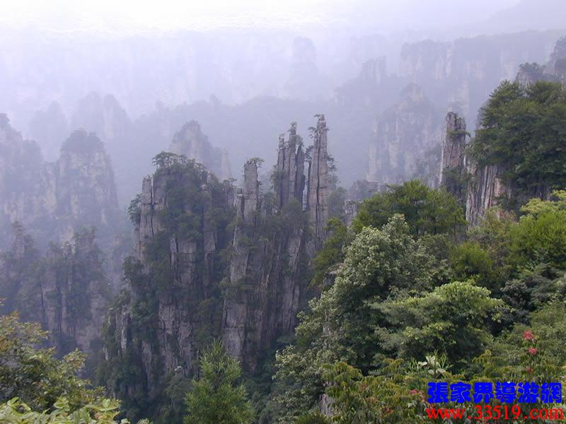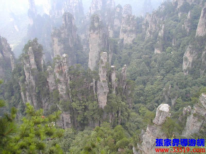 (大觀臺)這就是大觀臺。極目遠眺,千百座奇峰盡收眼底。一位詩人說,武陵源的砂巖峰林是一步一觀景,千步千造型,一山有四季,十步不同天。專家測算出武陵源石峰有3103座。一如一位高超的雕塑大師,模擬宇宙萬物,無不形狀逼真,維妙維肖,栩栩如生,呼之欲動。有的如海螺出水,有的如金龜銜日,有的如蓮花盛開,有的如天橋橫空,有的如長槍刺天,有的如寶塔聳立,有的如老人采藥,有的如玉女梳妝,有的如將軍出征,有的如戰(zhàn)馬長嘯,有的如情人幽會,有的如夫妻相擁,有的如仙女散花,有的如村姑守望有的孤峰獨秀,有的直插云霄,有的婷婷玉立,有的威武勇猛,有的小巧玲瓏,有的大氣磅礴。進入武陵源,但見一片峰的森林,峰的世界,峰的海洋。挺拔、奇秀、集中、原始、粗獷、古野。這就是武陵源。一位藝術(shù)大師說:武陵源的山峰,改寫了山的概念。大攝影家陳勃說:“三山五岳堪比美,華夏風(fēng)光每一流。”王繼杰先生說:“武陵源上三日游,勝讀千篇李杜詩。”許世杰先生說:“秀幽險峻稱奇絕,五岳黃山拜下風(fēng)。”李成瑞先生為此大抱不平:“神州勝景誰為最?須請霞公重評勘。”可惜徐霞客無緣到大觀臺來,也不可能為武陵源作甚評價了。