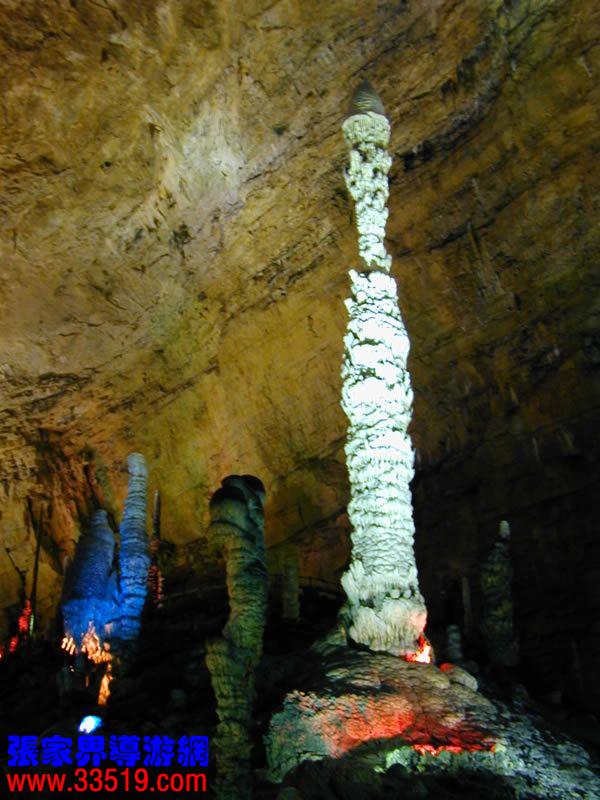 (龍宮)龍宮是黃龍洞十三個大廳中最大的一個,也是景色最美的景點之一,底面積15000平方米,平均高40米,兩千余根石筍拔地而起,千姿百態(tài),異彩紛呈,或如飛禽走獸,或如宮廷珍藏,有的像巍巍雪松,有的像火箭升空。龍宮后園有金銀兩座花池,清水常溢,花簇盛開。宮頂鐘乳柳垂簾掛,四周壁畫栩栩如生。溶解著各色各樣的礦物質(zhì)的水,從巖層中滲透出來,滴落下來。礦物質(zhì)在洞頂凝固結(jié)晶成倒懸鐘乳石,從鐘乳石滴落的水又把礦物質(zhì)澆疊、堆壘在洞底,而長成節(jié)節(jié)向上的石筍。大家看看這龍宮的造型,領略這磅礴的氣勢。洞內(nèi)最大石筍,高12米、直徑10米的漢白玉天然石椅“龍王寶座”居高臨下,眾多石柱石筍似人似物,維妙維肖,圍著寶座朝拜山呼,幾十座珊瑚亭亭玉立,儼然一支龐大的“宮廷樂隊”。湖南著名教授羊春秋先生作《寄生草》詞對此進行描繪:“百態(tài)千姿模樣,三宮六院門巷。龍王開宴設瓊漿,猴王偷果鬧天堂,君王納寵擁羅帳。搬演了人間爭攘,匯集了天下奇觀。”