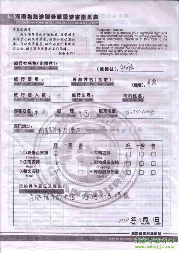 2010年8月1日岳陽李小姐一行5位旅游質(zhì)量反饋
