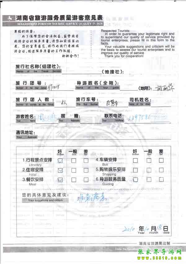 2010年10月18日周先生一行5位旅游質(zhì)量反饋:非常滿意